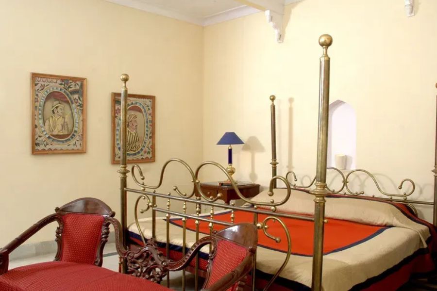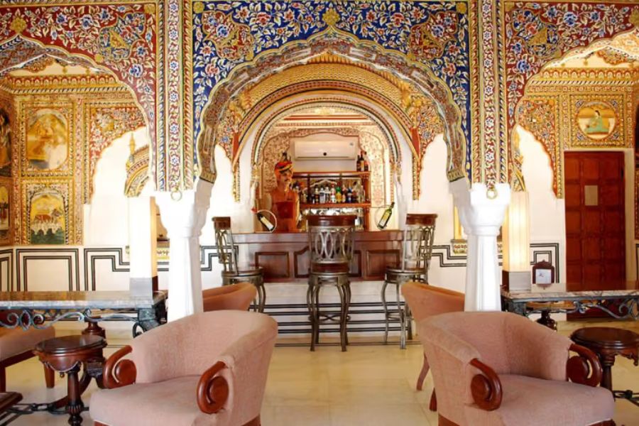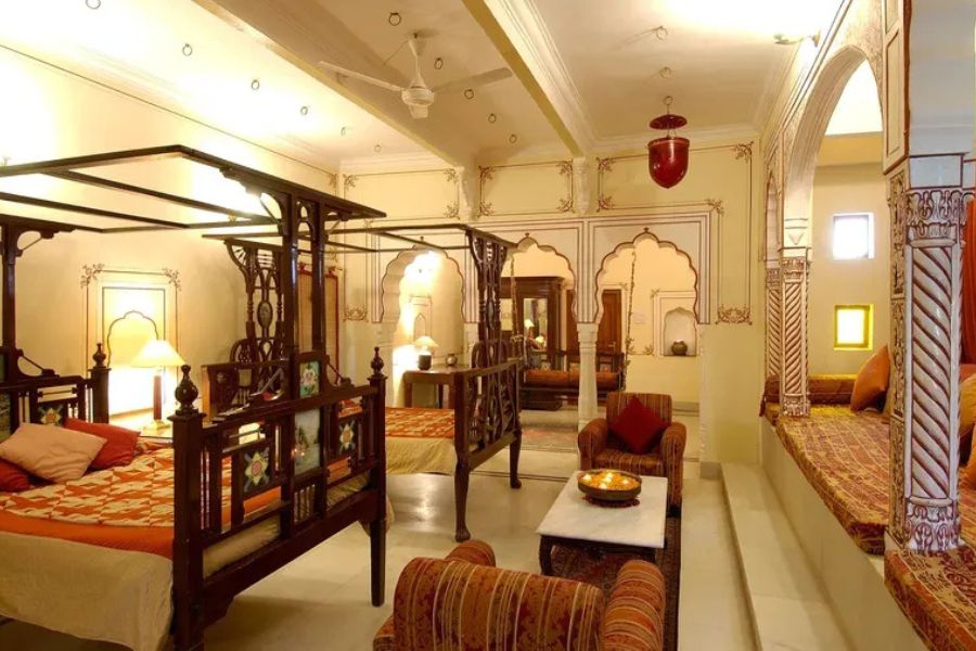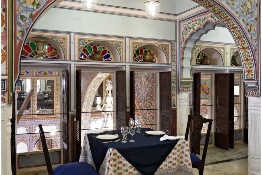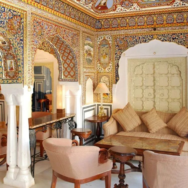 Its frescoed walls, arches, courtyards and terraces reflect centuries of Shekhawati heritage, offering an atmospheric stay rooted in trade-route history. The property feels both historic and hospitable, with rooms that blend carved details and modern comfort. Located in the heart of Mandawa, the hotel allows guests to explore painted mansions, narrow lanes and artisan workshops at an unhurried pace. It brings together heritage, warmth and authenticity—qualities valued by travellers on the best escorted tours of India.