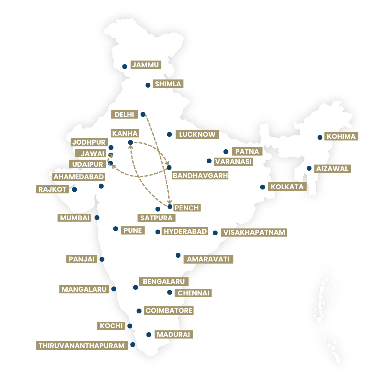 This 14-day India wildlife tour takes you through the country’s finest tiger and leopard landscapes, beginning in Delhi before continuing to Pench, Kanha and Bandhavgarh—three of India’s most celebrated tiger reserves—where dawn and dusk drives offer chances to observe tigers, leopards, sloth bears, wild dogs and abundant birdlife. Thoughtful pacing lets you absorb the character of each park, from Pench’s teak forests to Kanha’s meadows and Bandhavgarh’s cliffs.After a restful night in Jaipur, the experience shifts into the rugged granite country of Jawai Rajasthan,