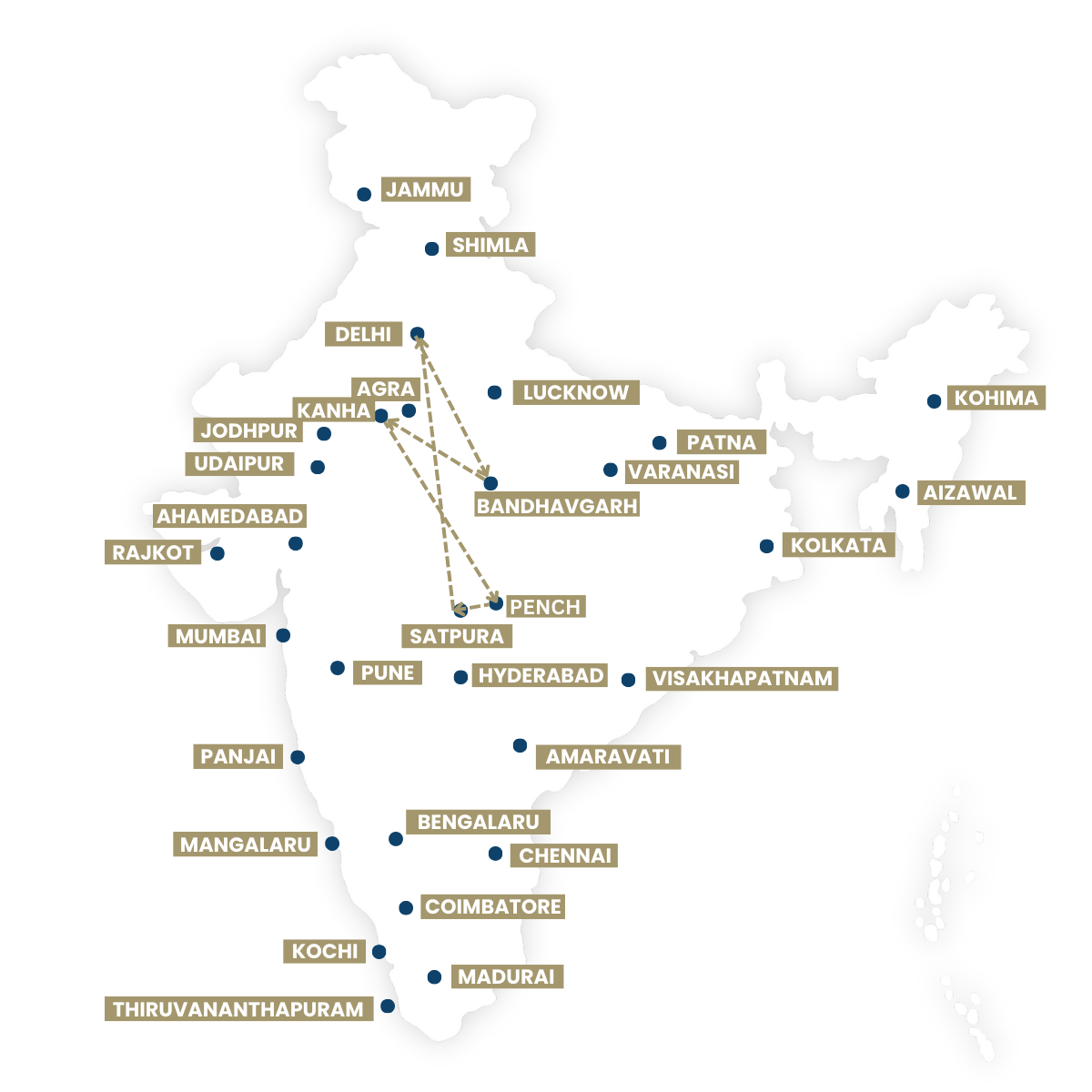 From the Old and New Delhi, Ruins of Mughal Empire, you will venture it all with a rickshaw ride, then zipping a flight to Kanha to sight tigers and tour the Bandhavgarh National Park. Then onward to experience more wildlife at Pench and Satpura National Parks. Jeep safaris, boat safaris and walking safaris – we have got it all ready for you! Then finally, you will return to Delhi for your onward journey home or to your next destination.