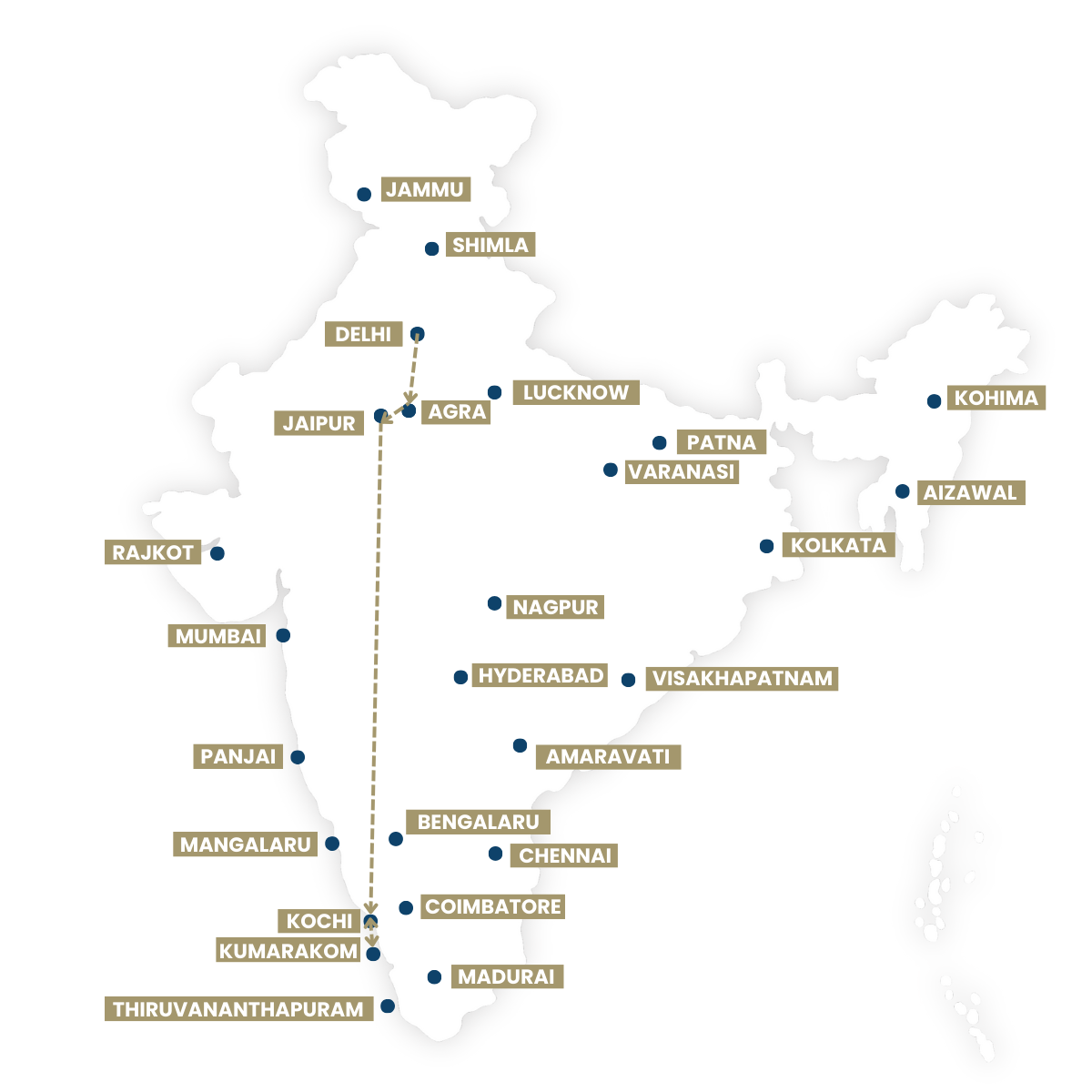 Coming to the end of your 10 day tour of India, we will transfer you to Cochin airport, a drive that will take approximately 1.5 hours, ensuring you reach there comfortably, to get your flight to your journey home or onward destination.