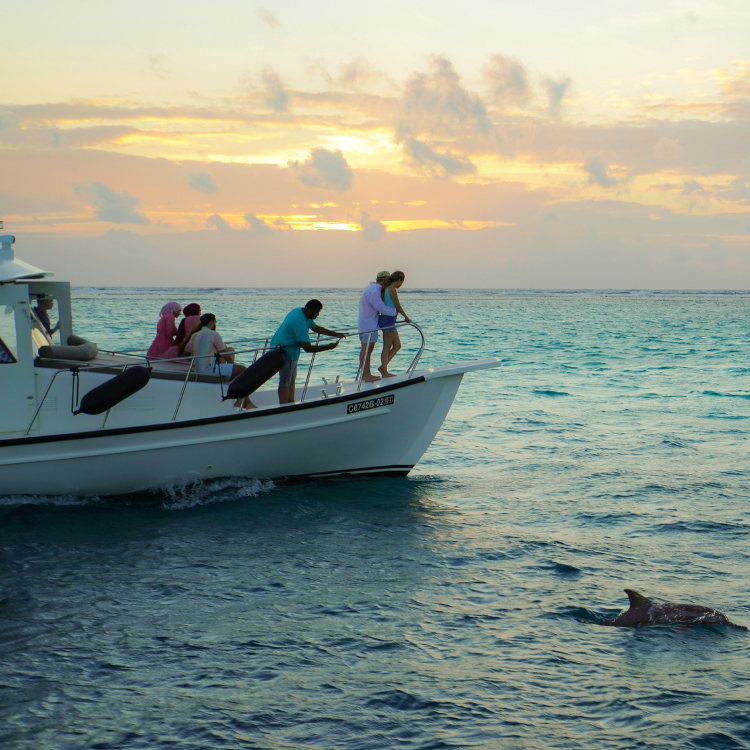 Boats cut through morning silver or sunset gold as spinners leap beside the bow — flipping, twirling, racing waves with pure, electric joy. This is where Maldives surf and water sports meet wonder rather than adrenaline. Children gasp, adults fall quiet, and the sea feels alive with personality. A Maldives holiday experience that softens even the toughest heart.