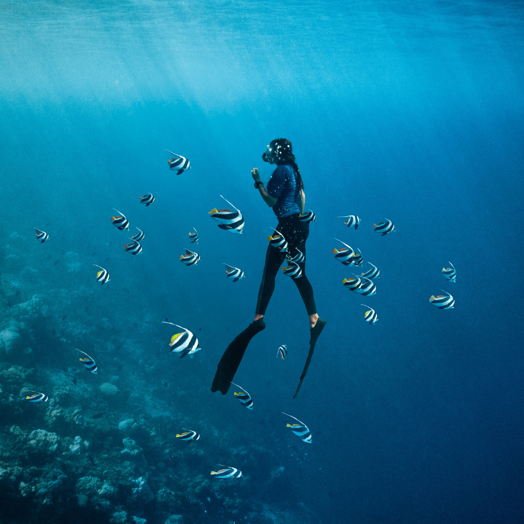 Meeru unfolds beneath you — coral towers, turtles drifting slow, sunlight slicing deep blue.