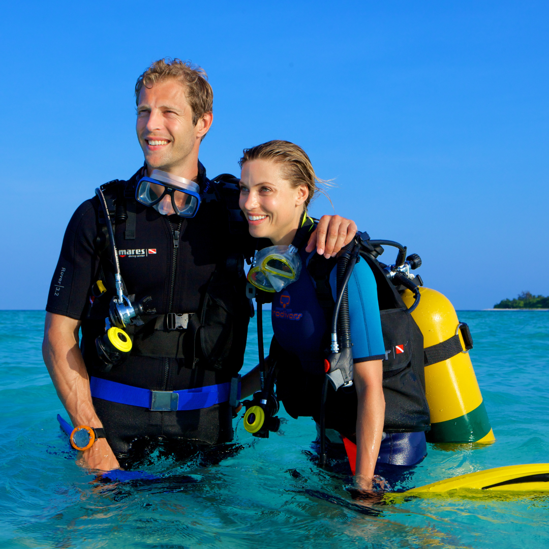 Scuba diving at Meeru shows why Maldives island resorts are diver legends — coral gardens bright as paint, reef sharks sliding quiet through cobalt, turtles grazing like old monks. Maldives diving and snorkeling here suits new and confident divers alike: easy entry points, warm visibility, mild current days, and deeper sites alive with trevally schools and rays.